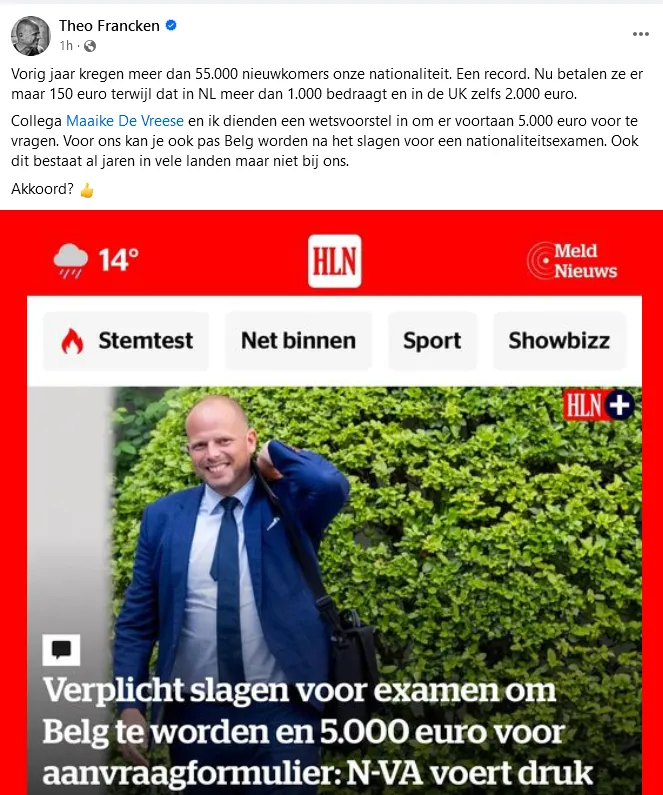 Theo Francken(NVA)在个人脸书上写道:去年,超过 55,000 名新移民获得了我们的国籍,这是个新记录,而他们只需支付150欧元的申办费。在荷兰入籍费用超过1000欧元,英国甚至达到2000欧元。我和同事 Maaike De Vreese 提交了一份议案,从现在起要收取5000欧元,对我们来说,只有通过国籍考试才能成为比利时人。这在许多国家都存在多年,但在我们国家却没有,同意吗?