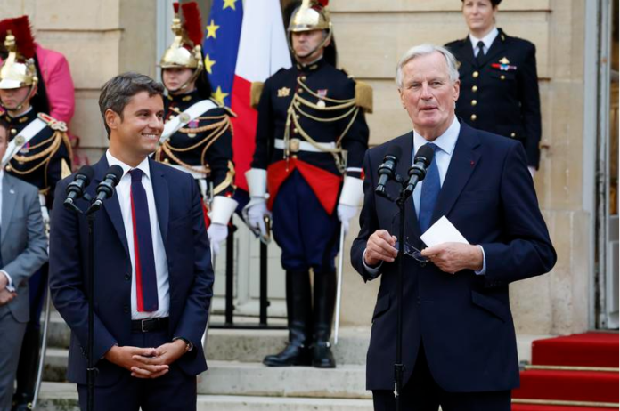 9月5日,在法国首都巴黎的总理府,米歇尔·巴尼耶(前右)和即将卸任的总理阿塔尔(前左)出席交接仪式。新华社发(亨利·施瓦茨摄)