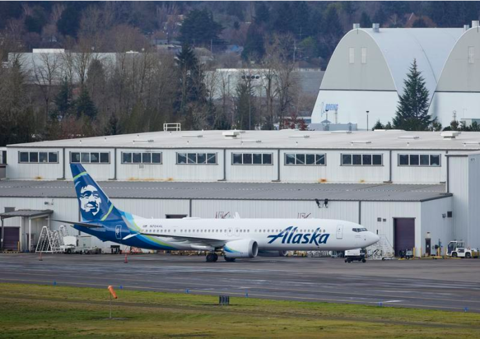 1月6日,美国阿拉斯加航空公司发生事故的波音737 MAX 9型客机停靠在美国波特兰的一处维修站。新华社/美联