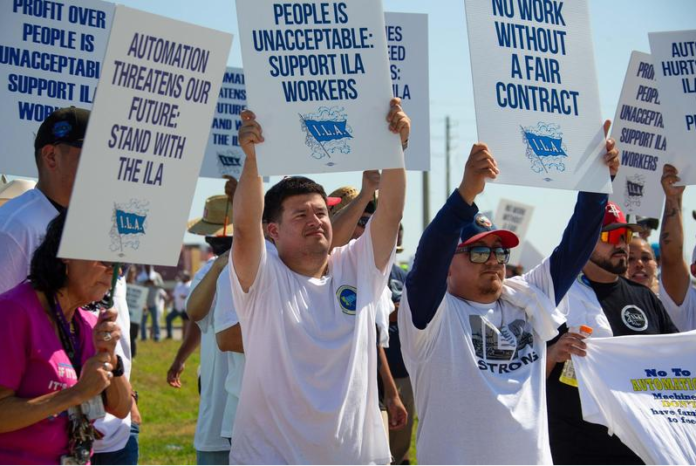 港口劳资双方现行主合同为期6年,原本今年9月30日到期,罢工因续约谈判破裂而起。据美联社报道,除涨薪外,工会的另一关键诉求是禁止在港口使用自动化机械装卸货物,缘于担心码头工人的就业岗位受到威胁。工会还就养老金缴纳和集装箱搬运服务抽成等方面提出条件。