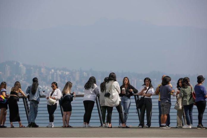 2023年8月26日,在加拿大温哥华,人们在烟雾笼罩的海滨休闲。新华社发(梁森摄)