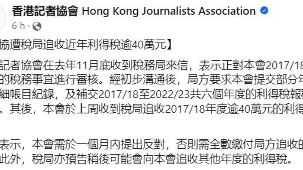 中華新聞通訊社/中華時報1月26日訊)記協聲明介紹說:“香港記者協會在去年11月底收到稅務局來信,表示正對本會2017/18年度起的稅務事宜進行審核。經初步溝通後,局方要求本會提交部分年度的詳細帳目紀錄,及補交2017/18至2022/23共六個年度的利得稅報稅表等。其後,本會於上周收到稅局追收2017/18年度逾40萬元的利得稅”。
