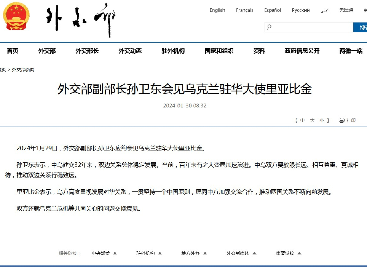 在北京,中國外交部副部長孫衛東,應約會見烏克蘭駐華大使里亞比金。