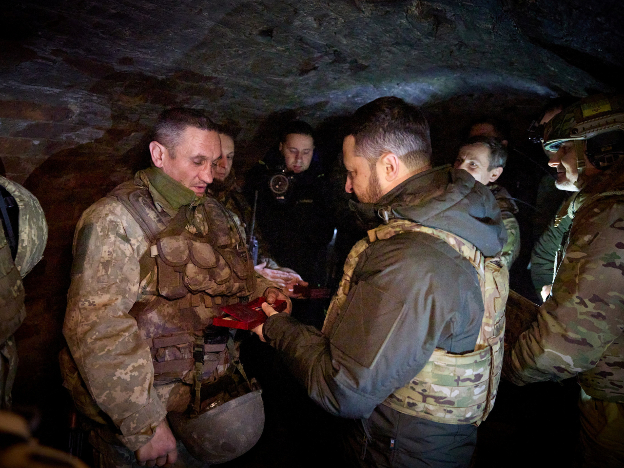 澤連斯基探望在前線參與俄烏戰事的烏克蘭士兵,向他們頒發獎章。(路透社)