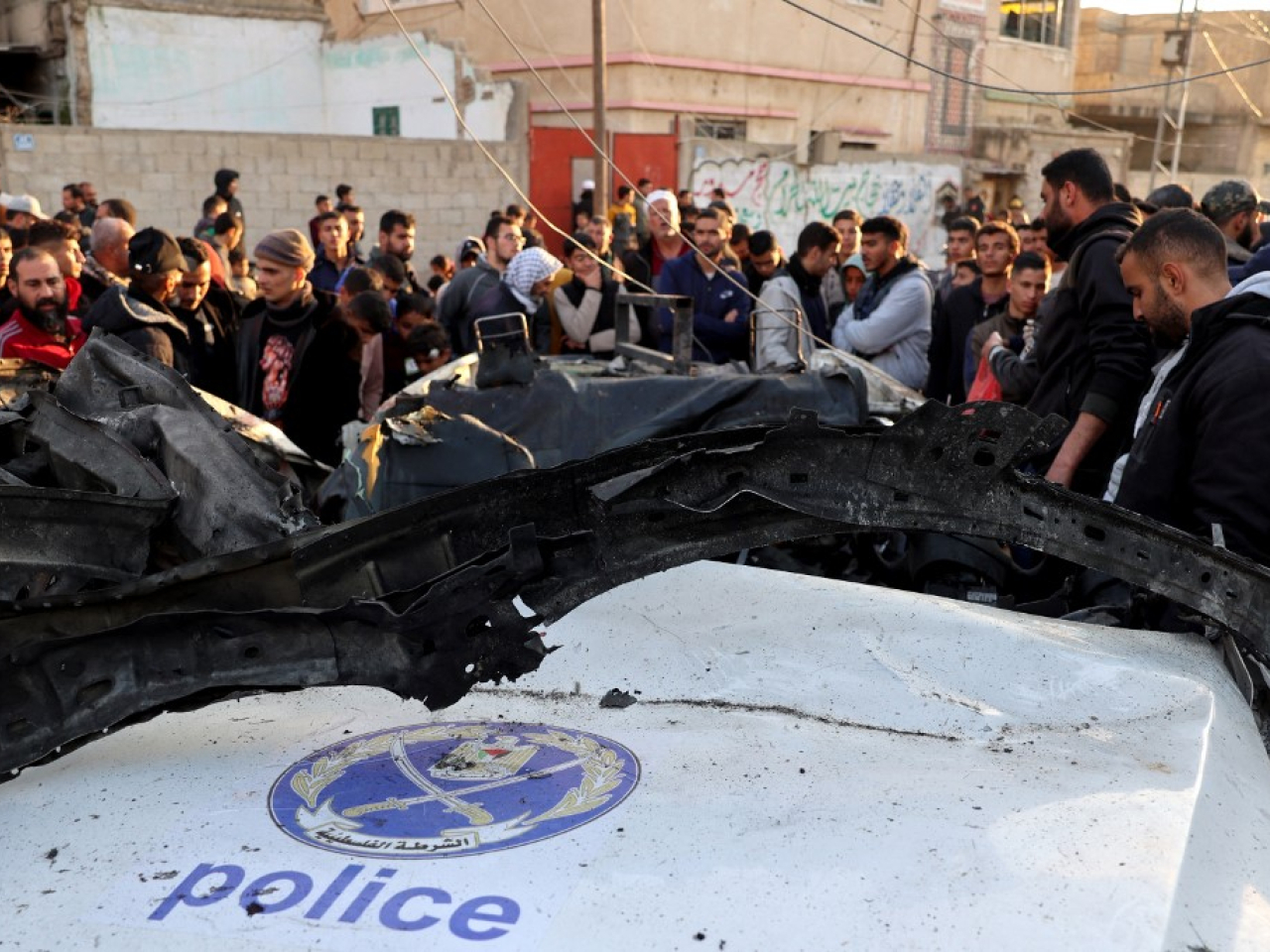 加沙衛生部門表示,以軍星期二空襲南部邊境城市拉法一架有警察標誌的汽車,造成六名巴勒斯坦警員死亡,這些警員當時正護送一架運送救援物資的貨車。(法新社)