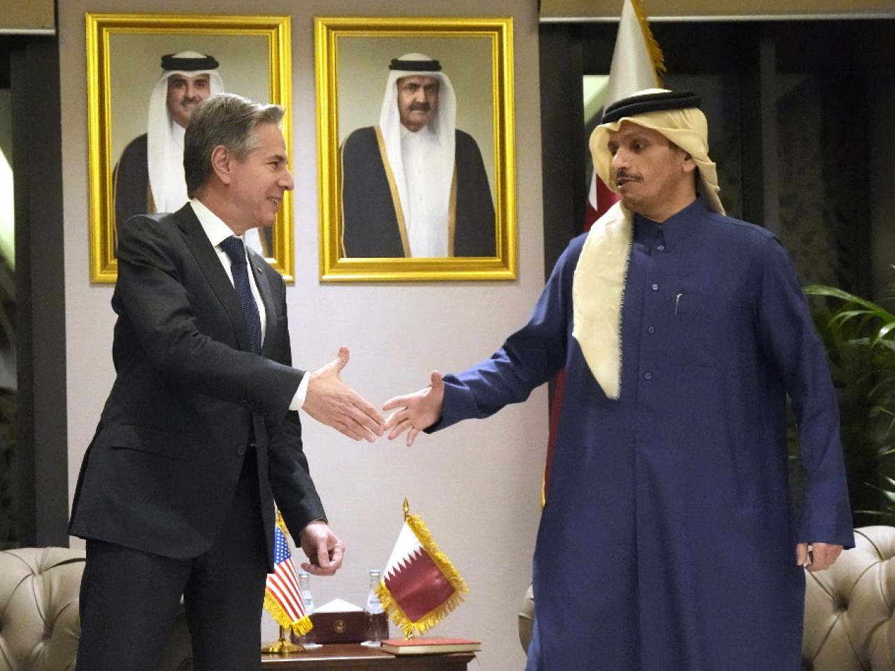 布林肯與卡塔爾首相兼外交大臣穆罕默德會面,討論以巴局勢。(法新社)