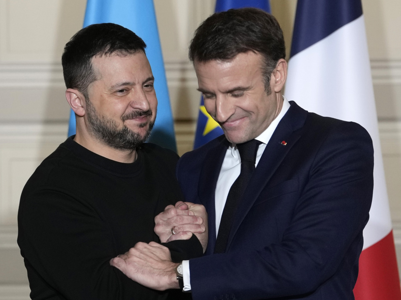 到訪法國的烏克蘭總統澤連斯基,在巴黎與法國總統馬克龍會談,兩人簽署一項新的長期安全協議,並共同會見記者。