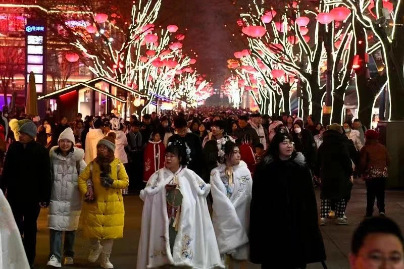 春節期間,西安的旅遊市場更是“buff疊滿”,迎來了新一輪的“熱辣滾燙”。大唐不夜城的燈火輝煌,吸引了無數遊客的目光。在這裏,人們可以穿梭在歷史的長河中,感受那個時代的繁華與喧囂。大雁塔下,古風漢服的年輕人仿佛從畫中走來,讓人穿越了時空,回到了那個盛世長安。
