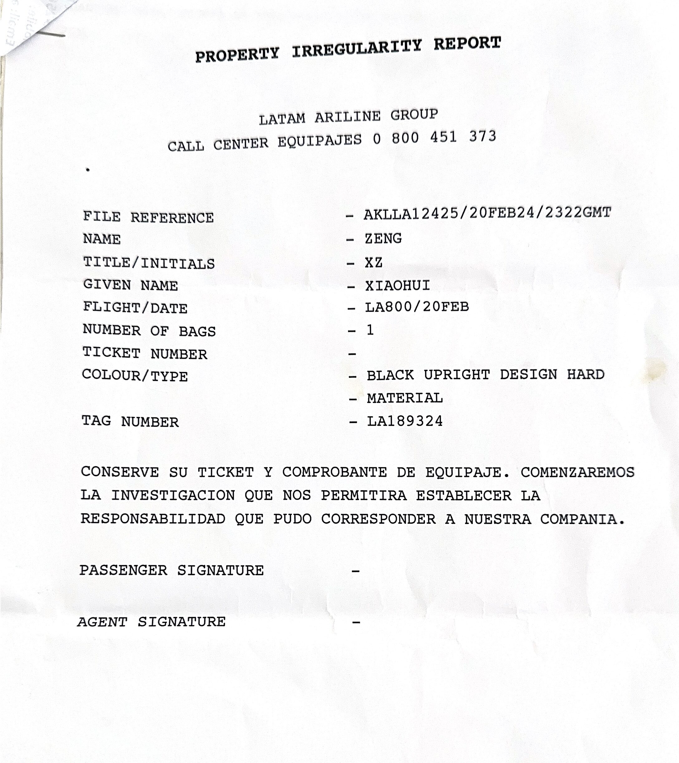 今天一早,我們聯繫了機場,機場工作人員讓我們聯繫相關航空公司,然後聯繫地勤服務人員,最後要求我們將行李送到指定服務點。我們驅車將行李送去,並說明瞭情況。工作人員查了很久,最後確認我的行李並沒有記錄在奧克蘭機場,而且之前我提走的行李是從中國北京國際航空公司的飛機運來的,而且昨晚八點已經登記為沒有取到行李的證書。