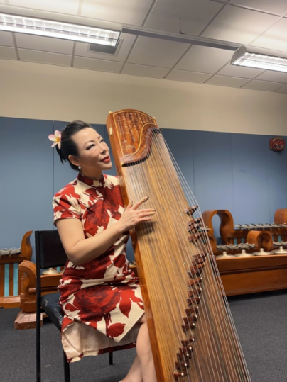 Sitting in front of the guzheng and plucking its strings, she brings forth melodious sounds as powerful as surging waves and as elegant as a gently flowing stream. With her music, Dr.Zou accompanied by her expressive body movements, fully immerses the audience in the story of the music.