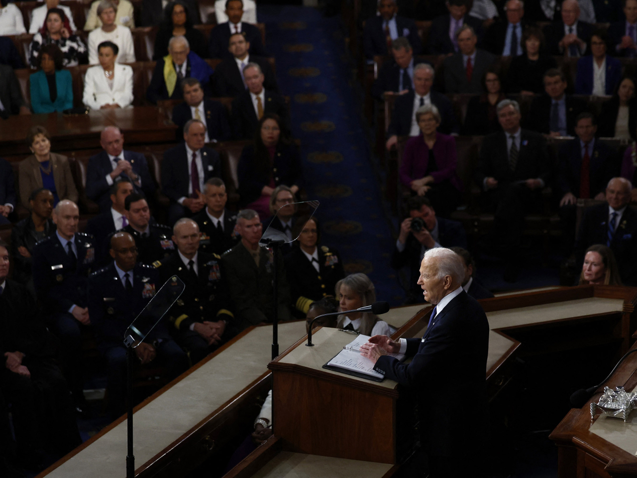 拜登在開場沒多久就提到美國必須增援烏克蘭,並向侵略烏克蘭的俄羅斯喊話說「我們不會袖手旁觀」。他不僅表示不會向蒲亭「低頭」,還嚴厲抨擊川普,「我的前任、這位前共和黨籍總統告訴蒲亭『做任何你想做的事』。」