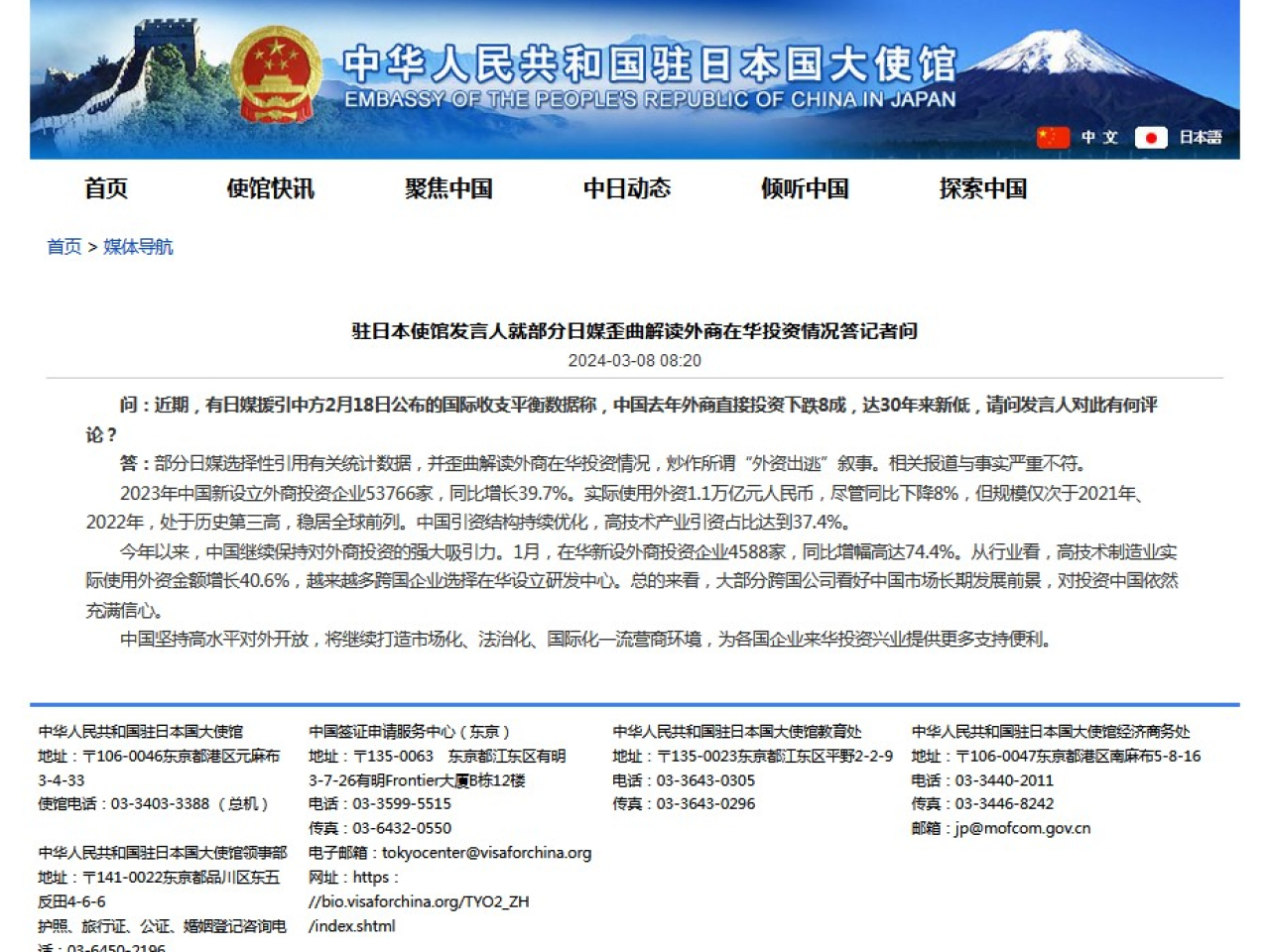 中國駐日使館批評有日媒炒作所謂「外資出逃」,稱相關報道與事實嚴重不符。(中國駐日使館網頁截圖)