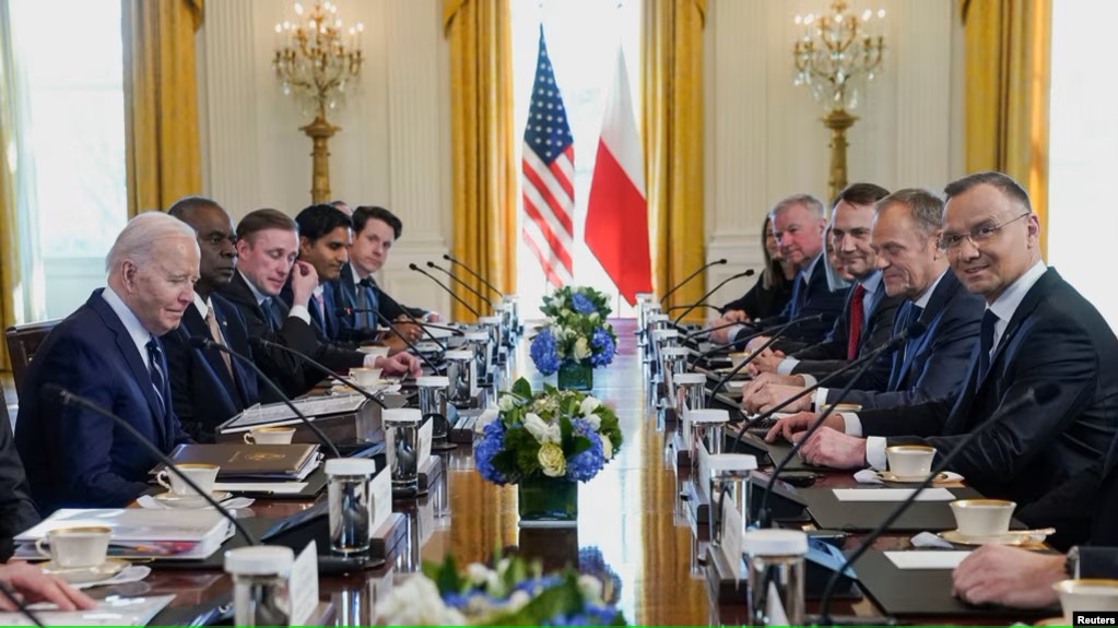 總統喬·拜登(Joe Biden)在波蘭紀念加入北約25週年之際在白宮會見波蘭總統安傑伊·杜達(Andrzej Duda)和總理圖斯克(Donald Tusk),美國資助烏克蘭抵禦莫斯科入侵的未來同時引發表示擔憂。