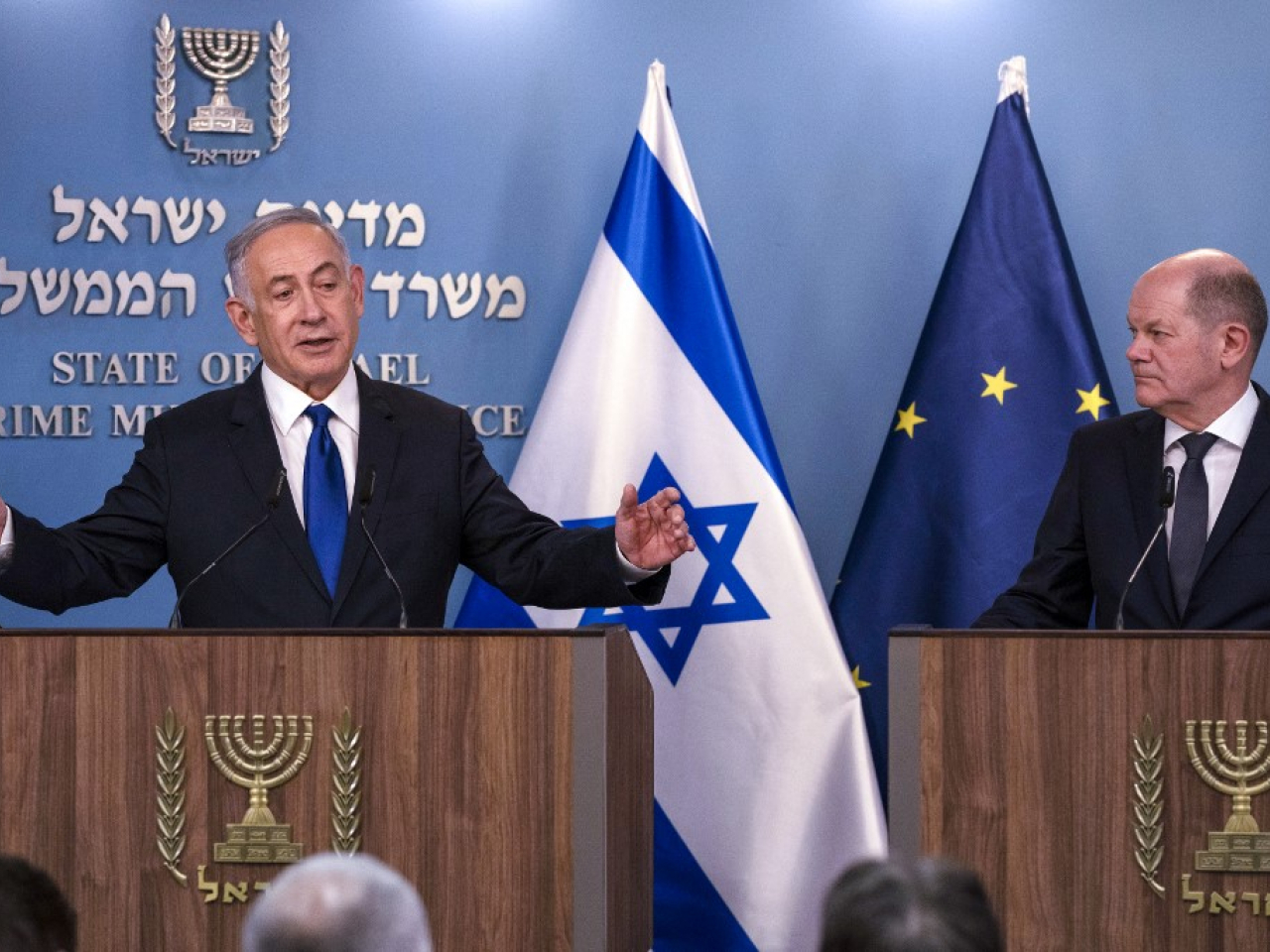 內塔尼亞胡與到訪的德國總理朔爾茨會面後見記者。他表示,已批准軍方將在拉法採取的行動以及疏散居民的計劃,又強調以軍的行動目標是消滅拉法境內剩餘的恐怖分子,亦不會將平民限制在這個地區。