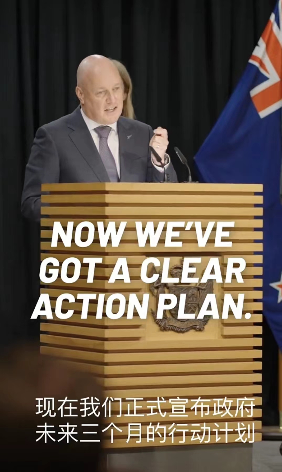 国家党政府顺利完成了我们首个百日计划,现在我们正式宣布政府未来三个月的行动计划。行动计划中一共有36项计划,行动计划中一共有8个关键倡议。其中包括:一、重建经济。将预算重点放在医疗、教育和警务等一线公共服务上,将Family Boost托儿教育税务补贴正式立法;二、减缓生活成本危机。将个人所得税减免正式立法,引入改善租房市场的法案;三、恢复治安与法治。就恢复“三振法案”法案做出决定,将反复犯下严重罪行的罪犯承担刑罚和责任;四、加强提供更好的公共服务。设定改善公共服务成果的目标,启动“学生出勤率行动计划”。新西兰人需要一个能做事的政府,国家党政府将带来有正面效果的重大改变。