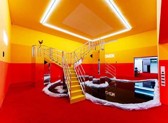 Yan Art空間所呈現的李琳琳個展中,一層展廳展出的作品《暸望塔》,以其複雜的結構和豐富的視覺元素,成功構建了一個多維度的體驗空間。例如,重新粉刷的牆壁顏色,展廳兩側牆面上懸掛的“Men”“Women”字樣的霓虹燈裝置,其光影投射於深邃的水面之中,為觀眾提供了一個既能感受溫度變化又能進行深度冥想的空間。