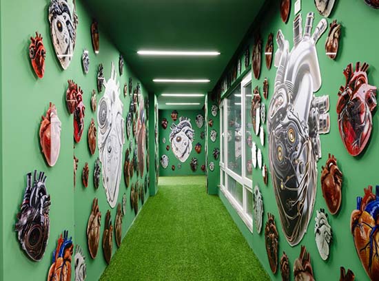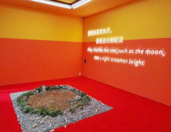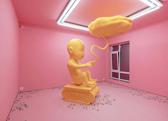 二層展廳中,藝術家運用金屬框架與地圖元素,打造了一個充滿對話性和想像力的空間,引導觀眾進行更為深刻的思考。作品《AI綠色通道》與《一個七天的世界》以生命為核心主題,展現了生命的多樣性與新生的希望。此外,作品Trephō(泰雷弗)與《魚缸》(天道酬勤)、《伊甸園》、《胎盤》、《遺忘之鏡》共同構建了一個涉及文字與表意、日常與超驗、個體與共性關聯的綜合體系。二層空間還特別設置了藝術家的臨時工作室,通過視覺、觸覺與情感的多重交織,引領觀眾進入一個充滿想像與反思的藝術世界。