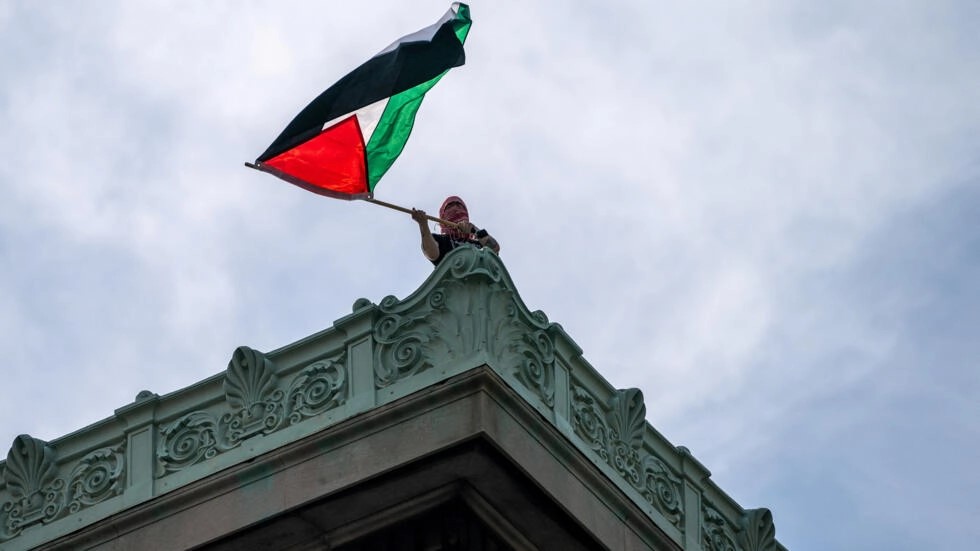2024年4月30日,美國紐約,聲援巴勒斯坦的哥倫比亞大學學生不理會學校當局最後通牒,佔領該校漢密爾頓大樓。圖為一名學生在漢密爾頓大樓屋頂上揮舞着一面巴勒斯坦國旗 REUTERS – David Dee Delgado