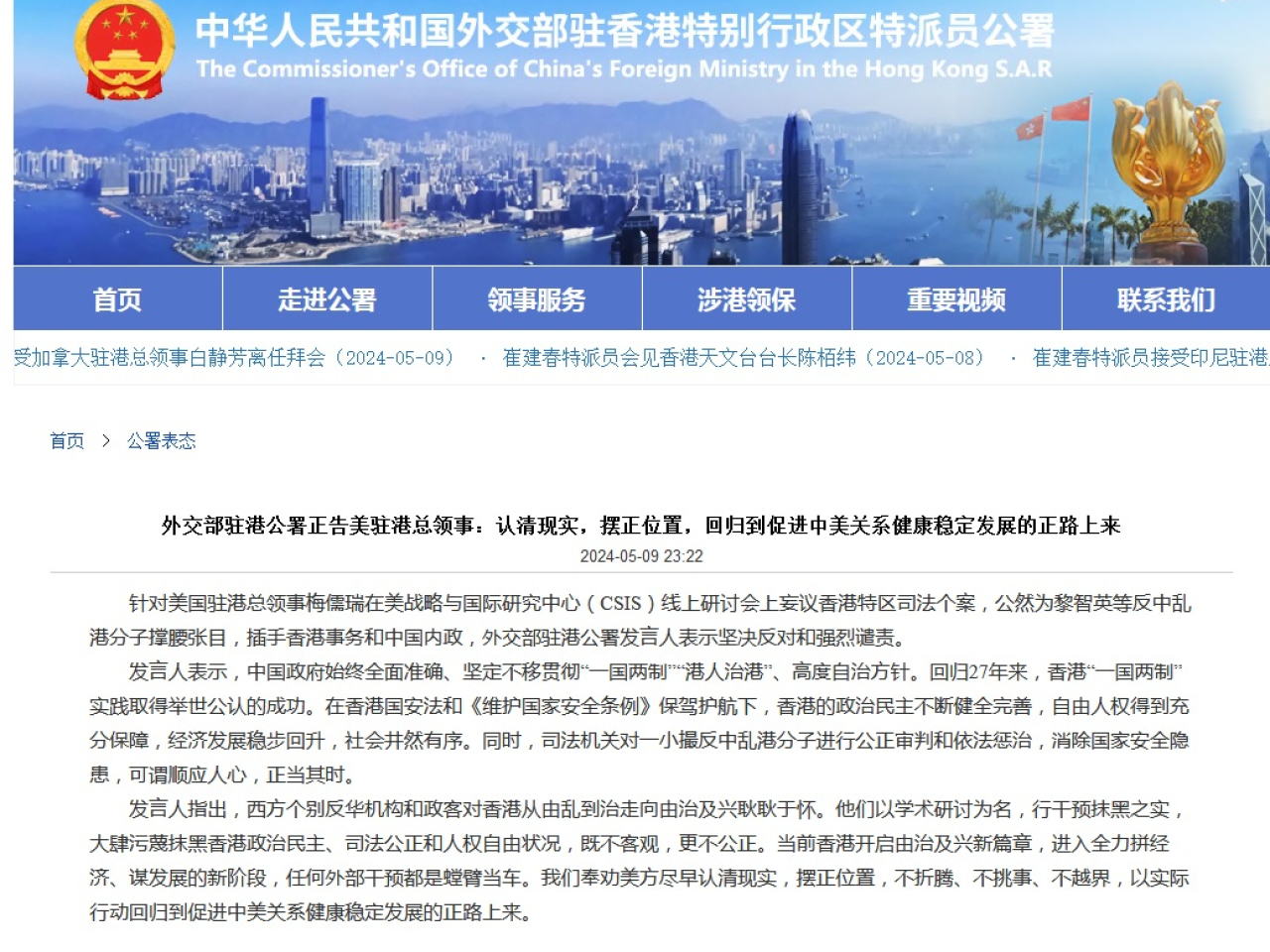 (中華新聞通訊社/中華時報5月10日香港訊)美國駐港總領事梅儒瑞(Gregory May)5月9日就美國對香港的政策發表講話,他表示,出於香港沒有尊重國際條約,若香港政府回到尊重中英聯合聲明的精神和條文,美國政府隨時準備好作出正面回應。他要求香港釋放黎智英及所有「因言無辜」入獄的人。中國外交部駐港公署發言人9日深夜發表談話時回應,批評他為壹傳媒創辦人黎智英「撐腰張目」,插手香港事務。