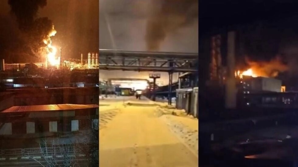 資料圖片:1 月 25 日(左圖)、1 月 21 日(中圖)和 2 月 3 日(右圖)俄羅斯境內的圖阿佩煉油廠、烏斯季盧加碼頭和伏爾加格勒煉油廠在烏克蘭襲擊後發生火災。 © Colaj France 24 cu imagini difuzate pe rețelele de socializare