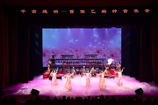 曾侯乙編鐘以聲音和文字互相印證方式,保存了2400年前的音樂記憶,改寫了世界音樂史。全套曾侯乙編鐘共65件,分三層八組懸掛在呈曲尺形的銅木結構鐘架上,上層為三組共19件鈕鐘、中下層五組共45件甬鐘,以及一件楚惠王贈送給曾侯乙的镈鐘所組成,鐘體及鐘架總重接近5噸。