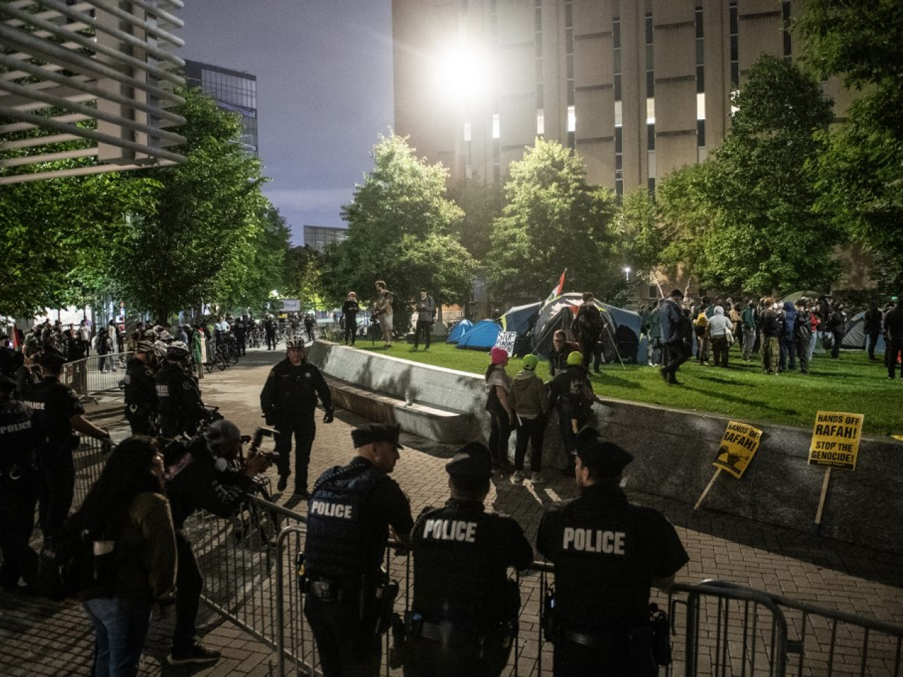 當地警方在星期二黎明前,以公共安全受到威脅為由,到大學的營地,驅散大約50名示威者,網上有片段顯示,警方在清場行動中使用了刺激劑,示威者被迫撤退後,前往一座監獄,聲援被捕人士。