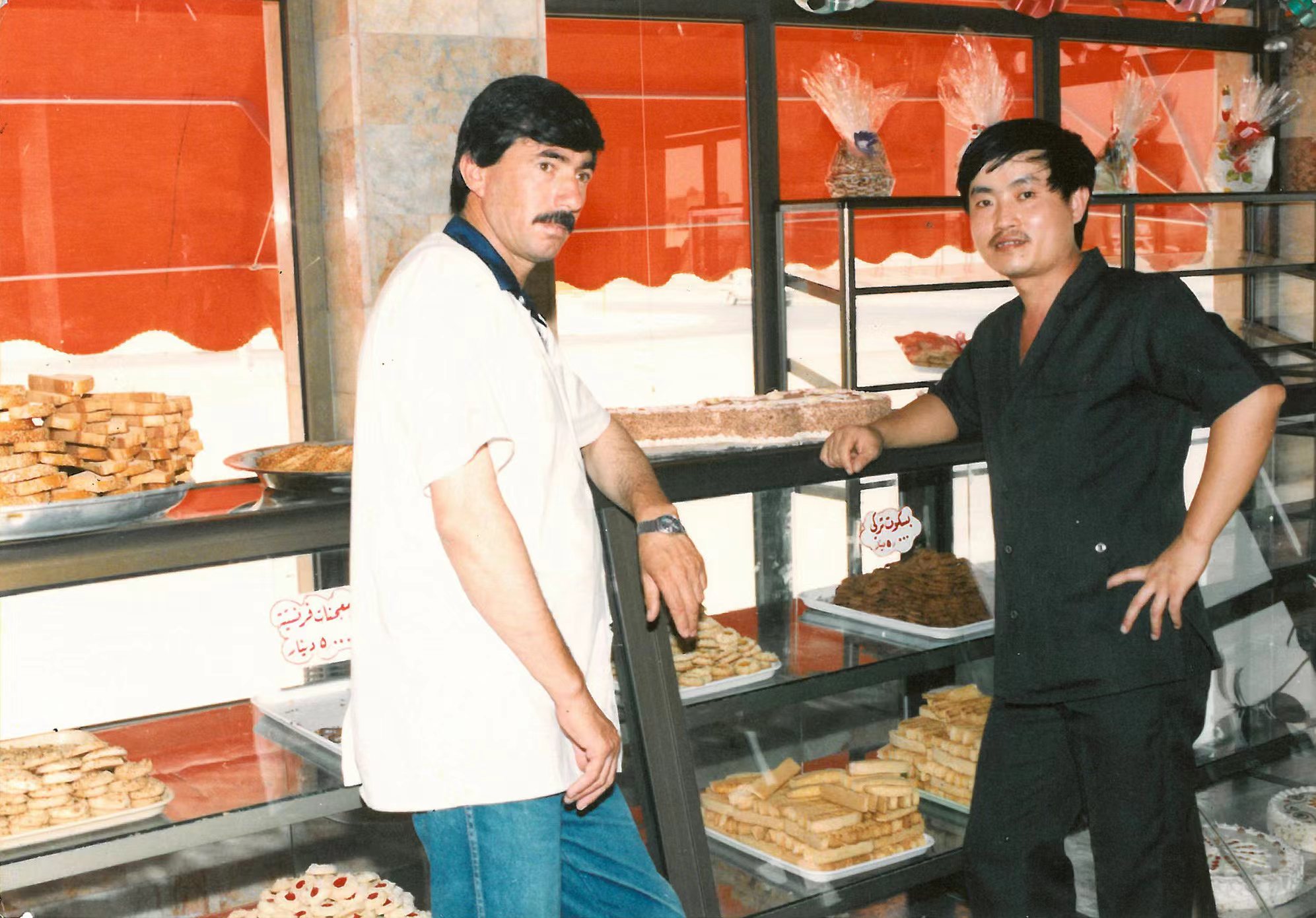 1984年,廉守柱(右)在土耳其傳授白吉饃製作技藝。(受訪者供圖)