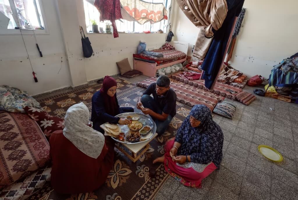 一個巴勒斯坦家庭16日在加薩南部的一處避難所裡吃早餐。(路透社)