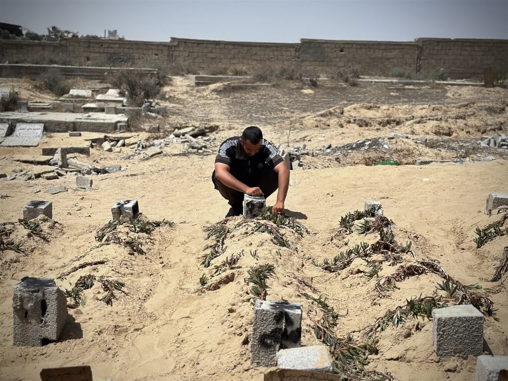 一名巴勒斯坦人16日在甘尤尼斯的墓地哀悼。(安納杜魯新聞社)
