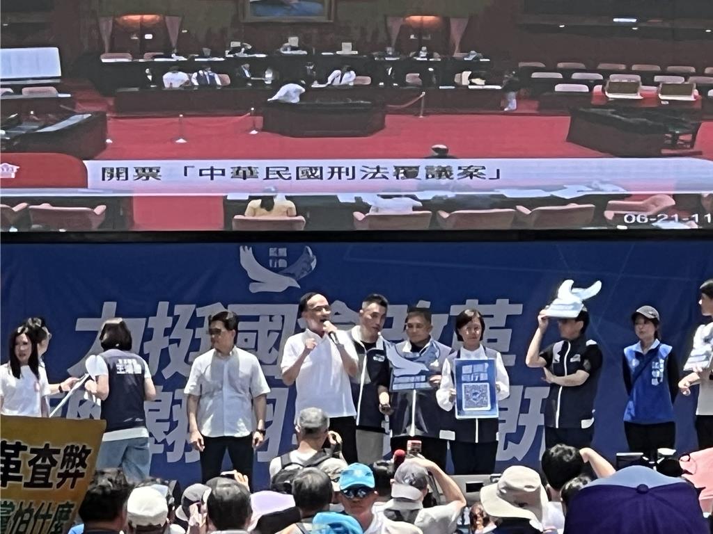而國民黨主席朱立倫原預計在11時30分壓軸登場,向支持國會改革群眾發表演說,不過朱約12時才現身。朱立倫批評,行政院抗拒改革,忘了台灣民主要向上提升的決心,賴清德上任後每天要跟民意對抗,今天到現場就是要展現與54位國民黨立委站在一起的決心,也感謝民眾黨8位立委,每票都展現改革決心。