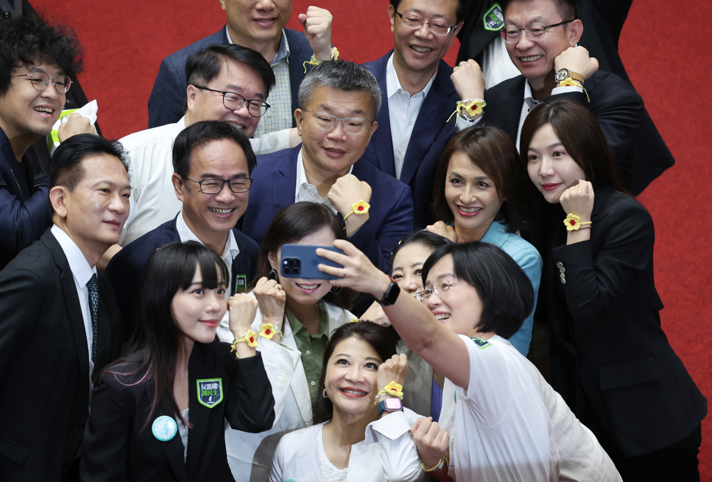 表決結束,傅崐萁率國民黨團成員在議場中高喊陽光國會、民主台灣等口號。台灣民眾黨8席立委也手舉反貪腐、護台灣的標語,在議場合影。