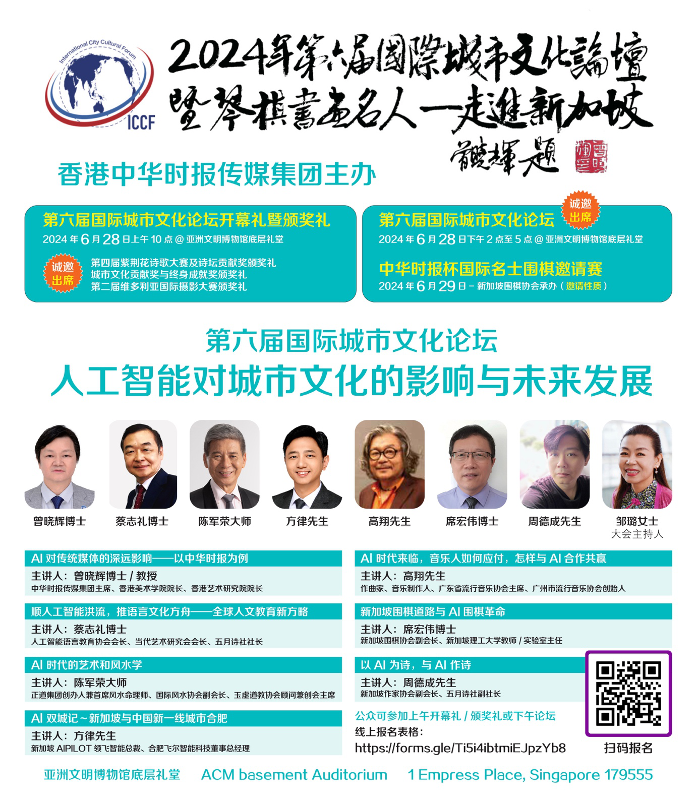 (中華新聞通訊社/中華時報6月26日訊)由中華時報傳媒集團(香港)主辦,香港藝術研究院、新加坡圍棋協會與多個新加坡文學、文化團體承辦與協辦、亞洲文明博物館贊助場地的第六屆國際城市文化論壇與系列活動,將於6月28日起至30日在新加坡舉行。本屆的大會主題是:人工智慧對城市文化的影響與未來發展。