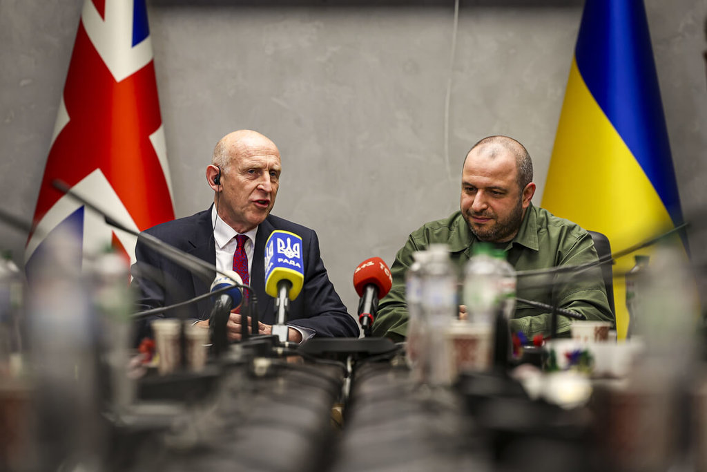 7日訪問烏克蘭敖德薩,與烏克蘭國防部長烏梅洛夫(右)會談並舉行記者會。(英國國防部提供).jpg)