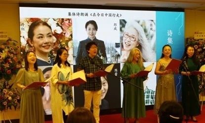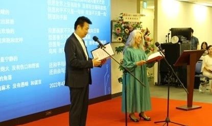 這些連接在詩與詩中間的詩句是張兢寫的,作為日本華文女作家協會的會員以及東京朗誦藝術團團員的雙重身份,她的才能在這場文學與藝術的盛筵裏得到了充分的展示與發揮,人們在她身上不僅領略了一個詩人的才華,也看到了她朗誦時展現出來的激情與她對語言對詩歌的掌握和詮釋。
