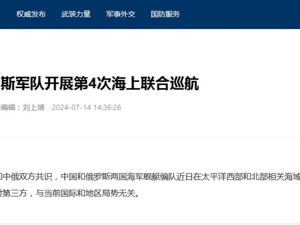 中國國防部在一份簡短聲明中說,中俄兩國海軍艦艇編隊近日在太平洋西部和北部相關海域開展第4次海上聯合巡航,此次行動與當前國際和地區局勢無關,也不針對第三方。
