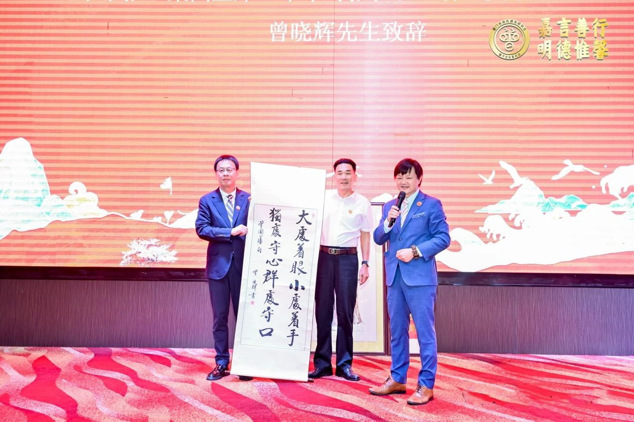 最後,我想贈送給廈門曾子文化委員會一幅我親手書寫的書法作品,內容是我們家先賢曾國藩的名言:”大處著眼,小處著手,獨處守心,群處守口”。這句話概括了儒家思想的精髓,希望大家能以此為鑒,共同維護和發揚曾氏家族的優秀傳統。