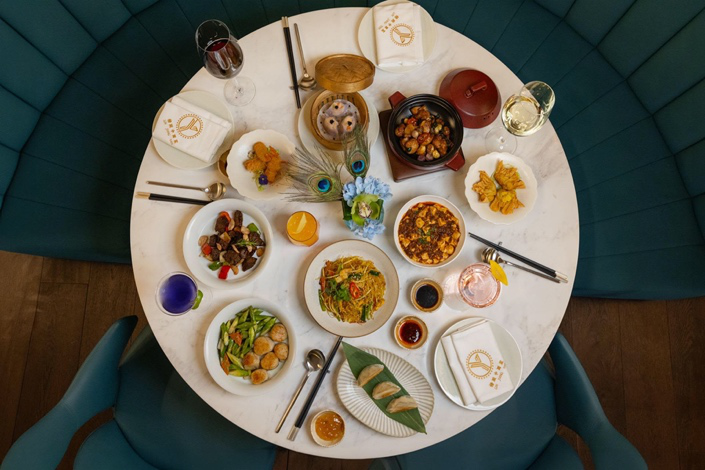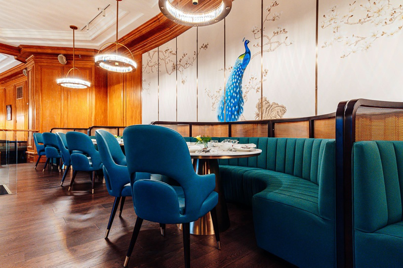 另一邊牆上懸掛的京劇劇照,表明了這家餐廳的中式招牌。 一張大幅孔雀彩畫在餐廳中央尤顯耀眼。 壁畫配合品牌的孔雀外文(Peacock London),亦寓意百鳥歸巢,客似雲來。