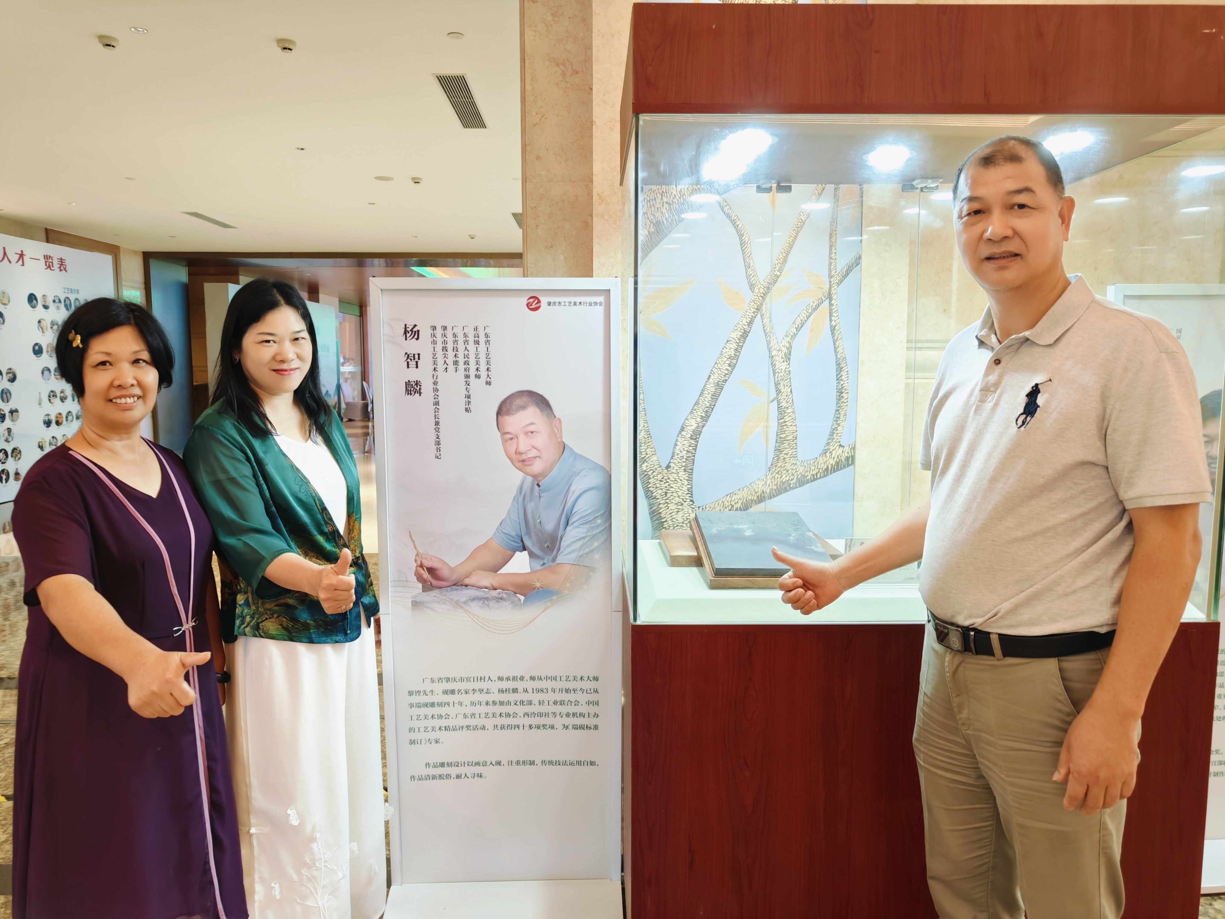 廣州新世紀藝術研究院代表馮少連(左2)與肇慶市工藝美術行業協會理事郭瑞芬(左1)、肇慶市工藝美術行業協會副會長兼黨支部書記楊智麟(右1)合影