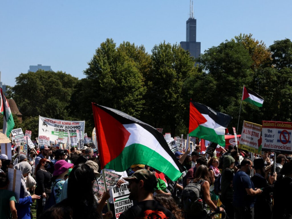 而在數千人在會場外抗議政府對以色列立場大會開幕前幾個小時,幾千名親巴勒斯坦示威者遊行到會場附近一個公園,抗議拜登政府在加沙戰爭中支持以色列的立場。有示威者表示,支持賀錦麗成為民主黨總統候選人,但由於賀錦麗的政綱缺乏對以色列的武器禁運和真正停火的具體政策,因此不能投票給賀錦麗。