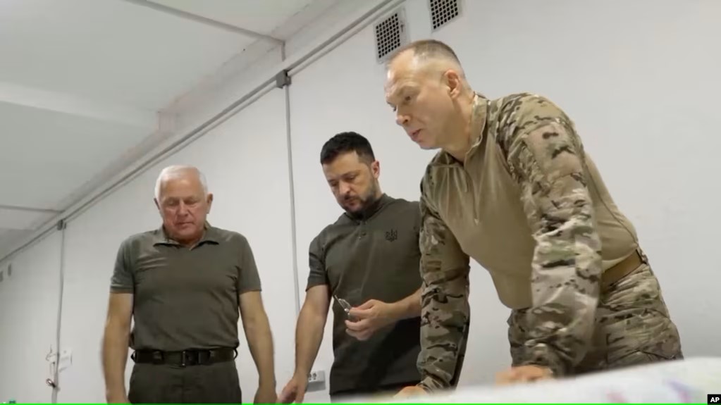 烏克蘭總統府新聞辦公室公佈的照片顯示,烏克蘭總統澤倫斯基(中)與烏軍總司令瑟爾斯基將軍(右)在訪問蘇梅州期間察看地圖。 (2024年8月22日)