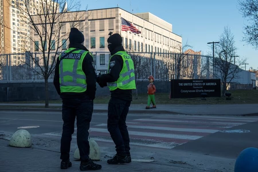 美國駐基輔大使館表示,未來幾天俄羅斯無人機和飛彈攻擊烏克蘭全境的風險提升。圖為去年2月警察站在美國駐基輔大使館外。(路透社)