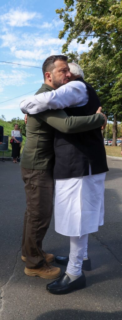 印度時報(Times of India, TOI)報導,莫迪(Narendra Modi)上個月前往莫斯科,正好發生俄軍飛彈擊中烏克蘭兒童醫院的悲劇,一張他與俄羅斯總統蒲亭(Vladimir Putin)擁抱的合照,飽受批評;如今莫迪訪烏,他也給了澤倫斯基(Volodymyr Zelenskyy)一樣的擁抱。