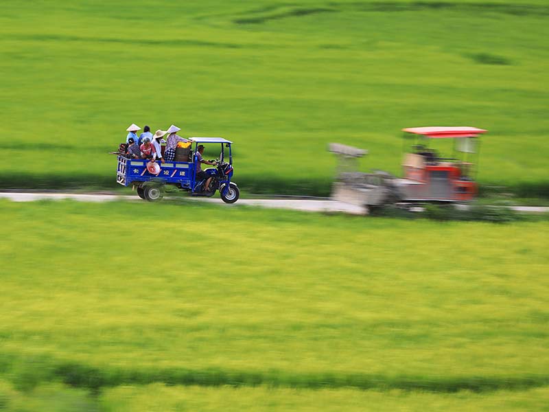 作品簡介:此作品高處遠距離長焦搖拍,2024年5月,江西省崇義縣關田鎮鄉村,農戶收工後乘坐三輪車途徑稻田間小道回家。
