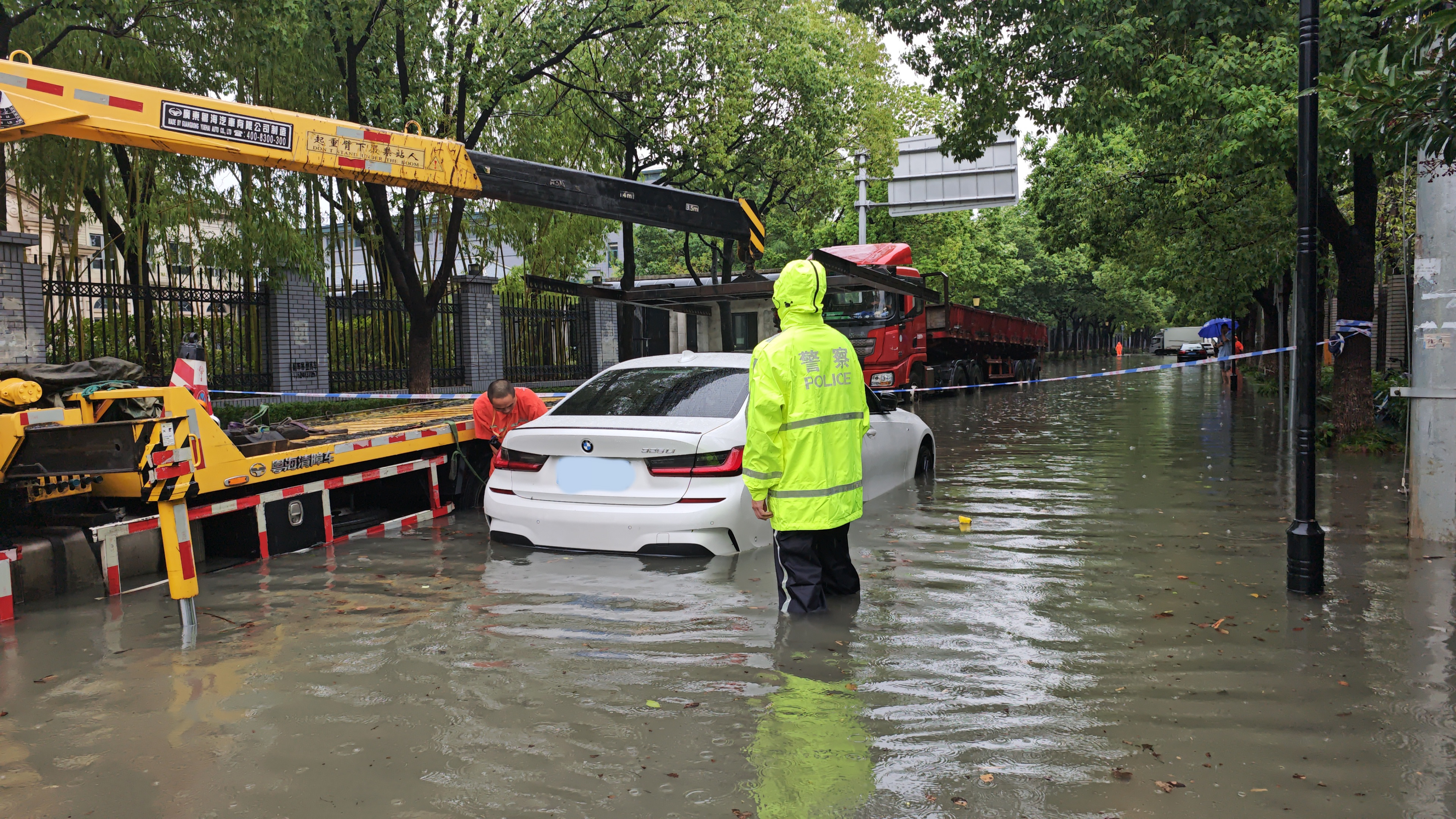 受颱風“普拉桑”影響,9月20日申城普降暴雨。上海市閔行區滬光路蓮花南路路口發生積水,有私家車發生故障無法啟動,上海市公安局閔行分局交警與消防、路政等部門協力救助。(上海市公安局閔行分局供圖)