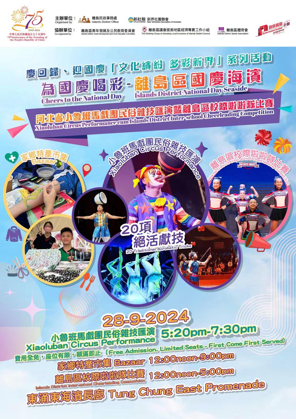 (中華新聞通訊社/中華時報 9月26日訊)為慶祝國慶七十五周年,以及響應政府的「十八區日夜都繽紛」,離島民政事務處聯同新界社團聯會將會在9月28日將於東涌東海濱長廊舉行「為國慶喝彩—離島區國慶海濱河北省小魯班馬戲團民俗雜技匯演暨離島區校際啦啦隊比賽」的大型慶祝活動。
