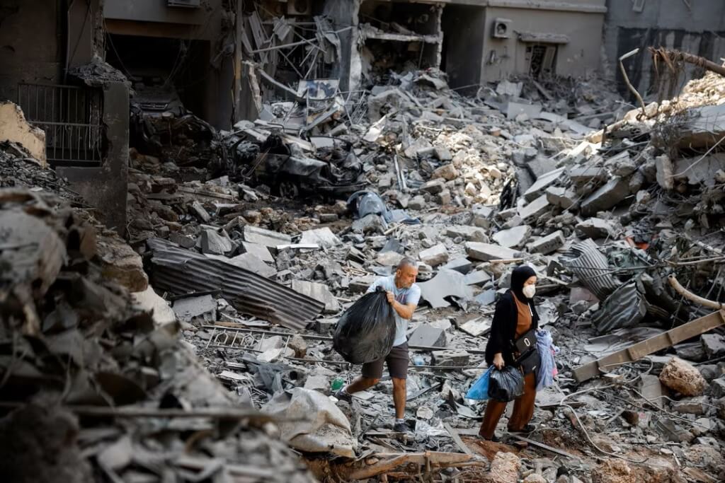 以色列猛烈轟炸黎巴嫩,貝魯特居民11日走在廢墟之中。(路透社)