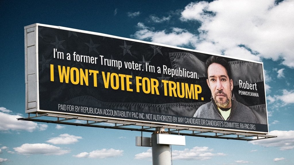 一群共和黨員在今年春天組成「共和黨選民反對川普」(Republican Voters Against Trump,RVAT)運動,在全美50州豎起大型廣告看板,尼克斯就是看板特寫的其中一名前川普選民。他的看板寫著:「我不會投給被判有罪的重罪犯」。