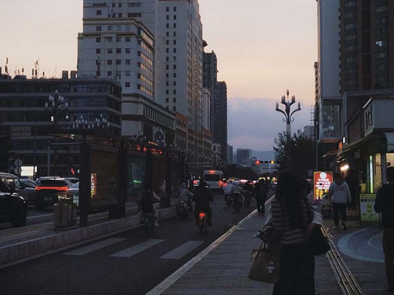 作品簡介:在高聳大廈間,川流馬路旁,華燈初起是夜生活開始;雲群缥缈如海市蜃樓;晚霞余晖似偷酒之绯紅。在大城市中,再快的節奏也要慢下來,壹起慢生活吧!2024年10月26日拍攝于傍晚的昆明市街道,運用手機拍的。