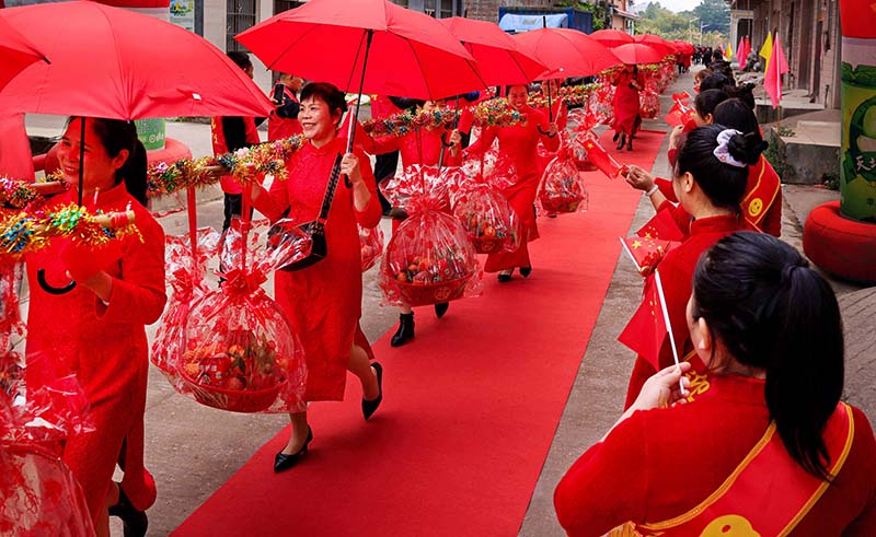 作品簡介:作品說明:2024年1月12日,廣東省肇慶市懷集縣王田村鄧氏攀相公太祖升座誌慶之際,全體外嫁女回娘家祝賀。照片展示了外嫁女臉帶笑容,肩挑禮物,身穿禮服,手打紅傘,行走在村屋前,並受到親人們列隊歡迎的喜慶場景。