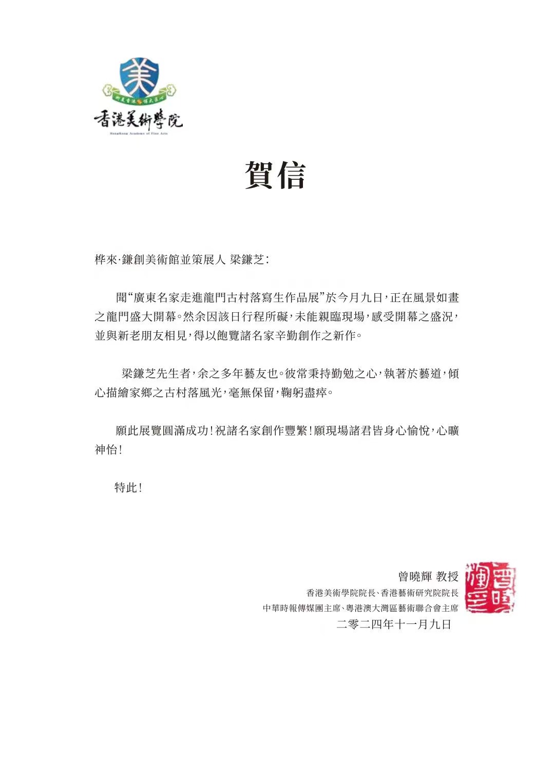 本次展覽還邀請了中華時報傳媒集團主席、香港美術學院院長曾曉輝教授,但由於曾教授要前往湖南曾國藩故里參加論壇,無法親自參加,他已寫了一份賀信,以祝願展覽圓滿成功。